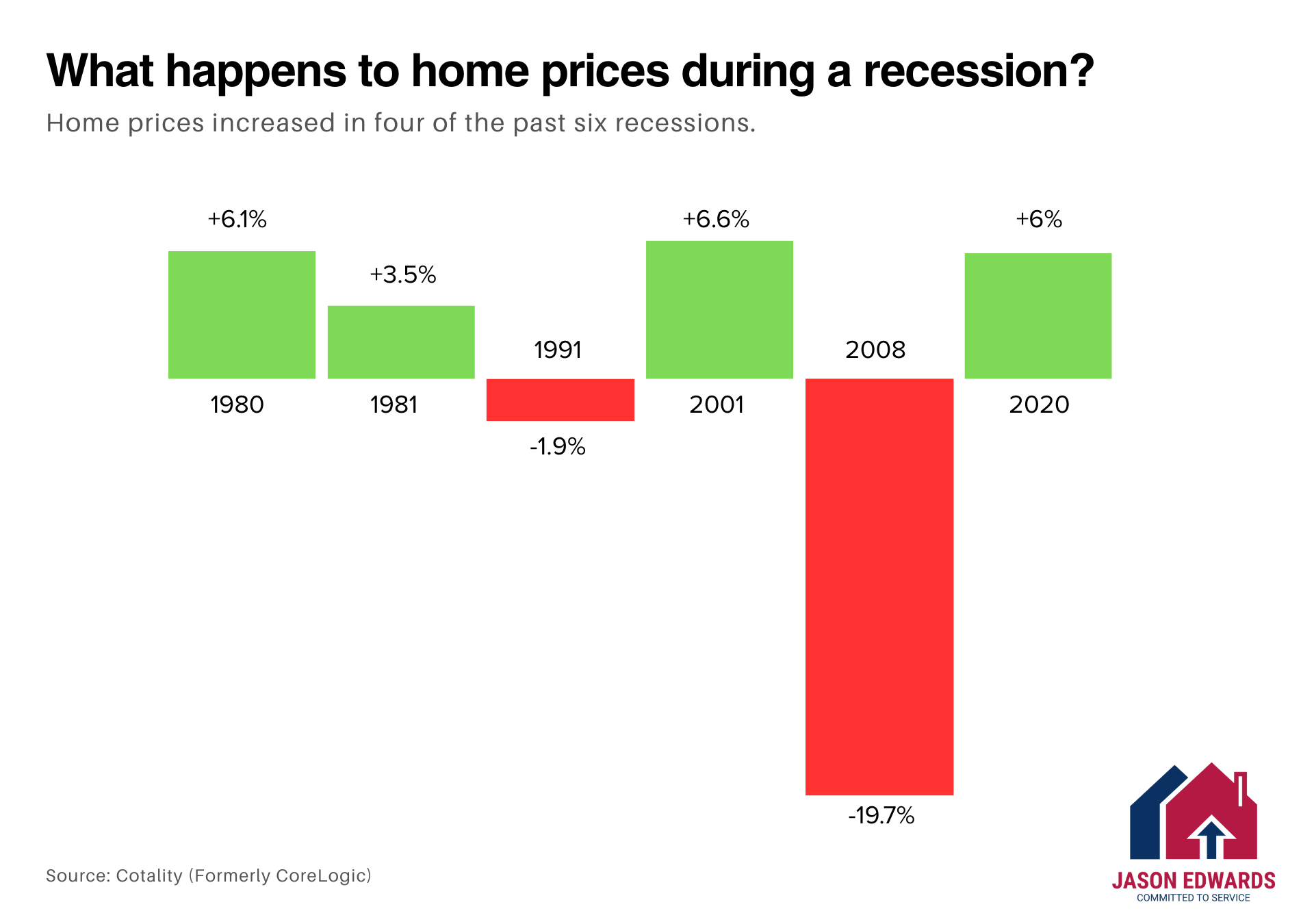 Data shows that in 4 of the last 6 U.S. recessions, home prices actually went up, and in one, home prices dropped less than 2%. The exception was 2008—and that was a very specific situation involving risky loans, overbuilding, and a financial system that was already on the brink.